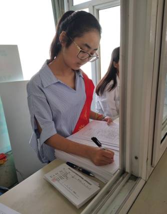 工作中,在院长的领导分配下,六人积极主动融入到工作中,队长吴千烨一马当先,跟随医生,帮忙给病人挂号,忙的不可开交;夏海宁、刘莹两人负责体检申请开单,笔耕不辍,一丝不苟,她们写下的不仅仅是数据,更是一份爱与责任,任务何等艰巨;洪汛海、孔军、于成龙三人是导医,负责给家长和宝宝引导体检流程顺序,疏散人群,以及帮忙照看宝宝,维持现场秩序。