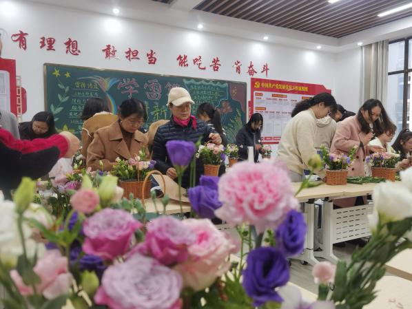 活动现场特邀专业花艺师进行讲解与指导。花艺师从花材识别、色彩搭配、造型设计等方面进行了生动讲解,并现场演示了插花的基本技巧。在悠然的花香浸染间,大家兴致盎然,充分发挥想象力和创造力,边学边做,一篮篮错落有致、生机盎然的插花作品在大家的巧手中诞生。活动现场欢声笑语,洋溢着温馨与喜悦。