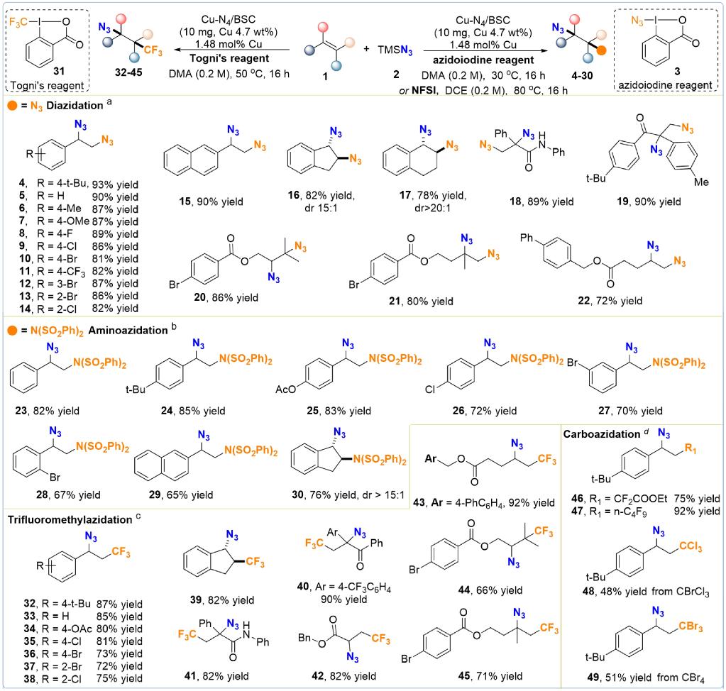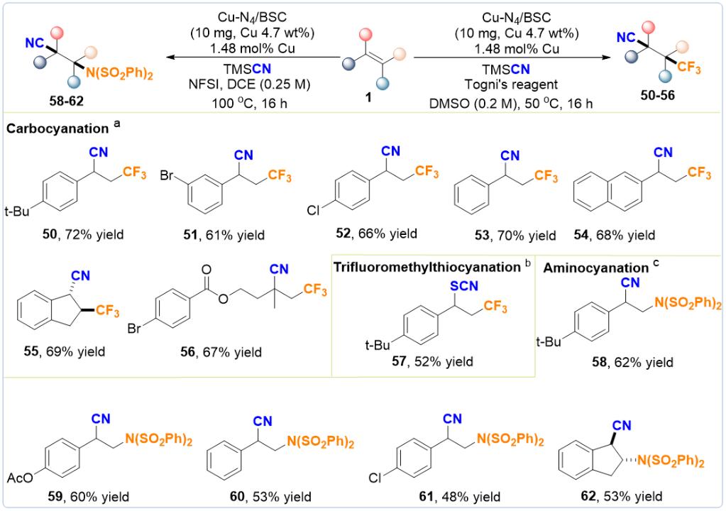 针对上述问题,曾杰教授团队开发了一种碗状碳负载的单原子铜催化剂(Cu–N4/BSC)。该催化剂通过模板辅助配位吸附–碳化策略构筑,使铜原子以单原子形式锚定于碳载体表面,形成高度均一的 Cu–N4配位结构。通过调控反应条件,同一催化剂体系可实现五种不同类型的烯烃的双官能化反应,包括双叠氮化、胺-叠氮化、三氟甲基-叠氮化、三氟甲基-氰化以及胺-氰化反应。该催化体系适用于较为广泛的底物范围(共58个实例),最高产率可达93%,并在环状烯烃反应中表现出较高的非对映选择性(dr > 15:1)。