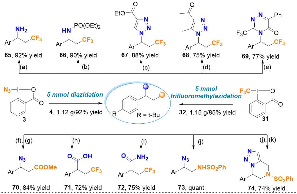 系统的机理研究表明,催化剂(Cu–N4/BSC)通过单电子转移过程活化高价碘试剂,生成自由基物种并加成至烯烃形成新的碳自由基中间体,随后经基团转移或碳正离子途径转化为目标产物。该催化体系在放大条件下仍保持稳定性能:在 5 mmol 规模反应中,双叠氮化和三氟甲基-叠氮化反应分别以92%和85%的收率获得1.12 g和1.15 g目标产物。催化剂经简单离心分离后可循环使用7次,活性保持93%。此外,所得产物中的叠氮基和氰基可进一步转化为胺、三氮唑、羧酸及酰胺等多种官能团。本研究首次实现了同一单原子催化剂催化烯烃的五种双官能化反应,为高效、可持续的含氮化合物合成开辟了新的路径。(撰稿:刘明凯 葛亮 审核:韩新亚 黄宇弦)